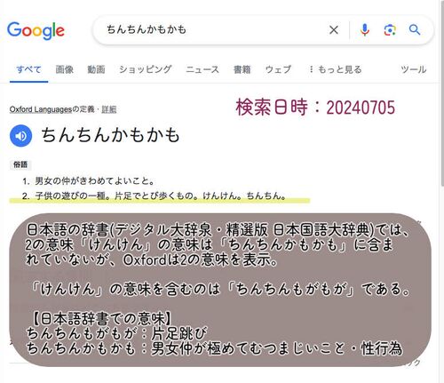 ▼Oxford Languages Google検索では、検索ワードに関連した語の意味や定義を「Oxford Languages」の情報を引っ張ってきて表示してくれます。 そして、今回「ちんちんかもかも」をGoogleで検索すると、下のような表示が出てきました。 出典:Oxford Languages…