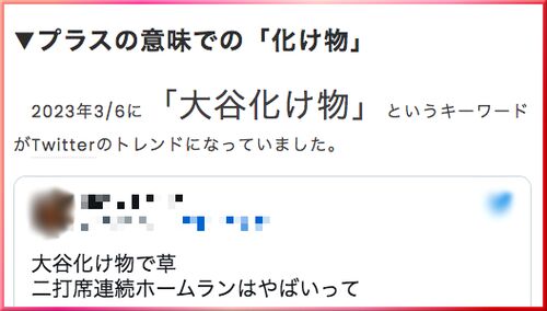 【3行】 ・「大谷化け物」のように、ホメコトバとして用いられることもある ・化粧を落とした自分を、マイナスの意味で「顔面化け物」と自虐でも使われる ・プラマイどちらの意味かを、そのコトバのみ判断できないことがある ▼プラスの意味での「化け物」 20…