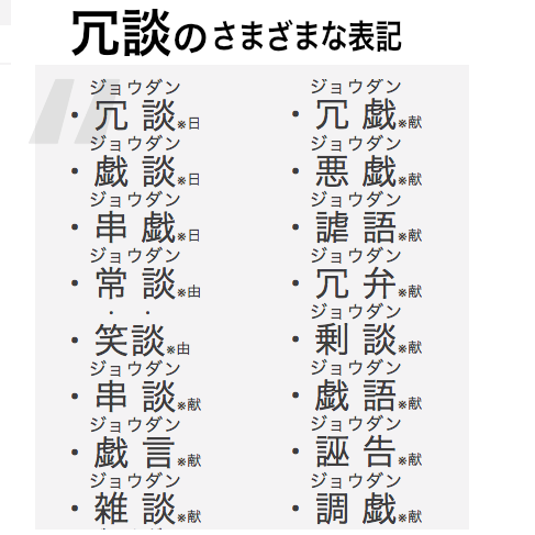 こちらの「ふりがな文庫」のURLで、「じょうだん」の他表記を探した結果。