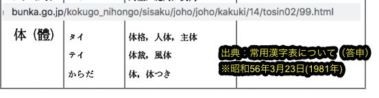 当用漢字音訓表 1947年仕様に「体」の訓読みに「からだ」が採用されていません。